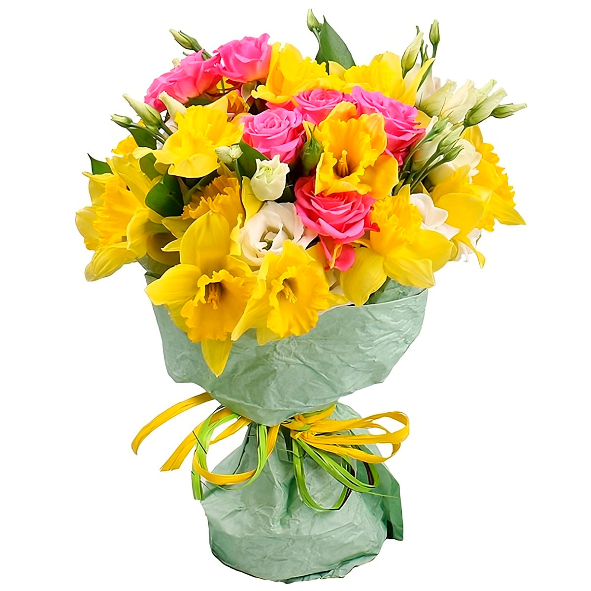 Нарцисс, эустома белая, роза кустовая розовая. Упаковка (лента, пленка, крафт, сетка, пленка матовая)