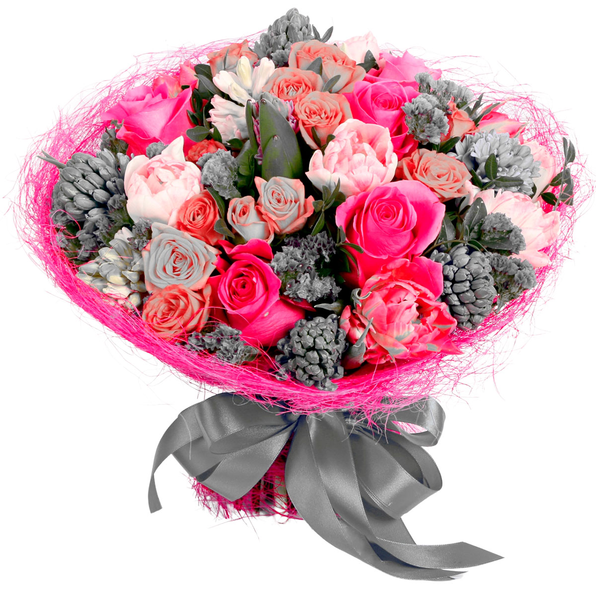 Роза одноголовая розовая, роза кустовая розовая, гиацинт с серым напылением, пион розовый, статица. Упаковка (лента, пленка, крафт, сетка, пленка матовая)