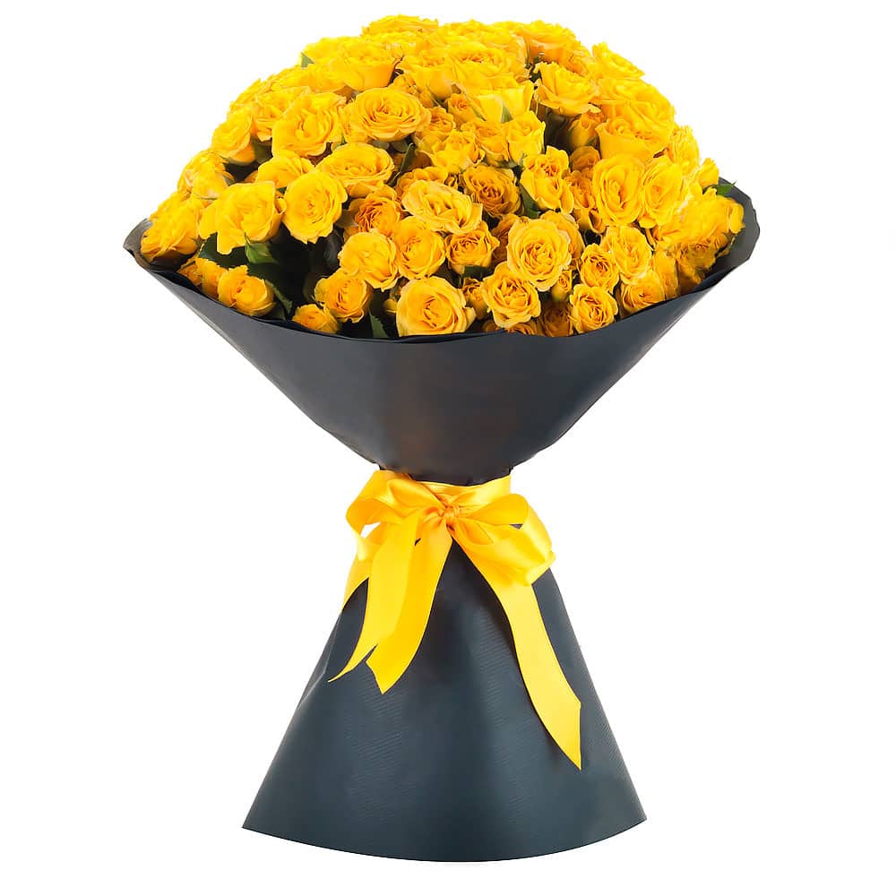 Роза кустовая желтая. Упаковка (лента, пленка, крафт, сетка, пленка матовая)