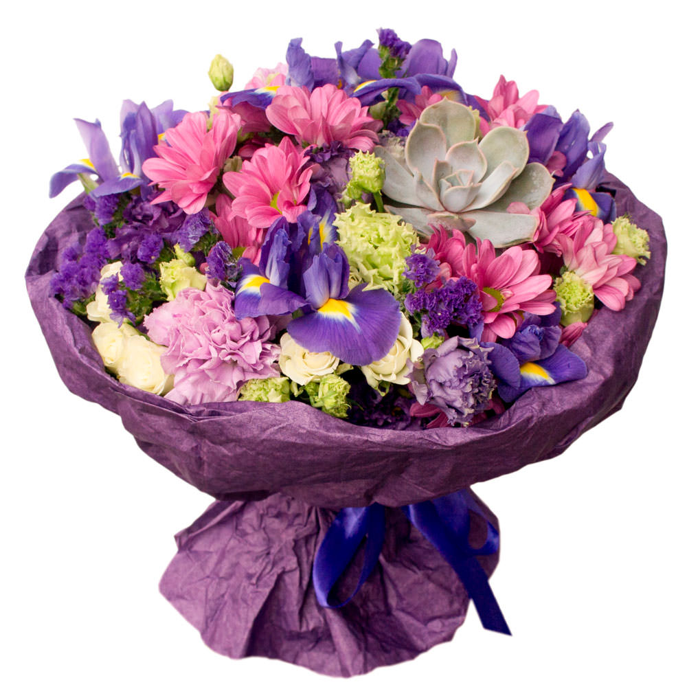 Гвоздика сиреневая, ирис, хризантема кустовая розовая, роза кустовая белая, эустома кремовая, статица, суккулент. Упаковка (лента, пленка, крафт, сетка, пленка матовая)
