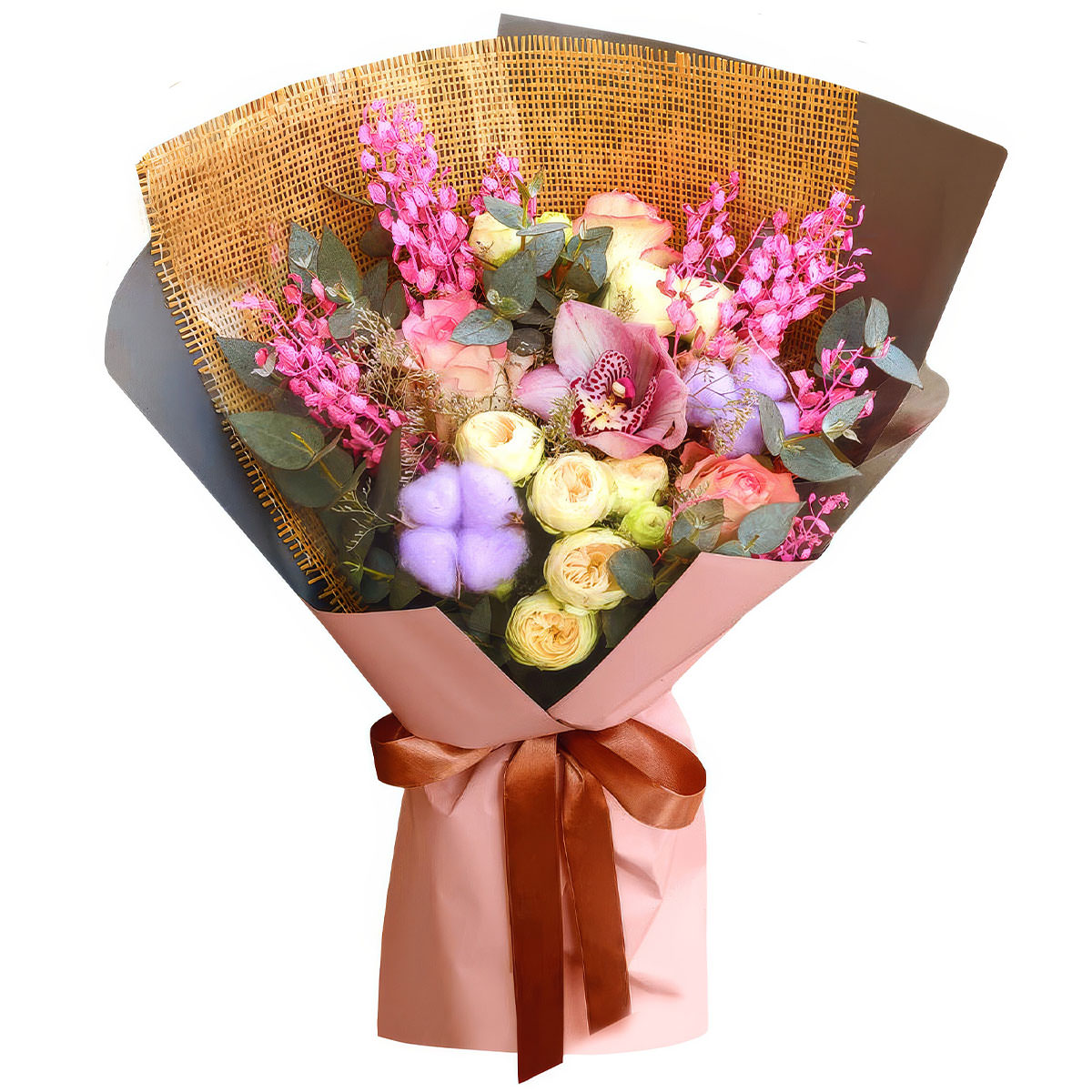 Орхидея розовая, роза кустовая пионовидная кремовая, роза одноголовая оранжевая, лунария розовая, хлопок, эвкалипт. Упаковка (лента, пленка, крафт, сетка, пленка матовая)
