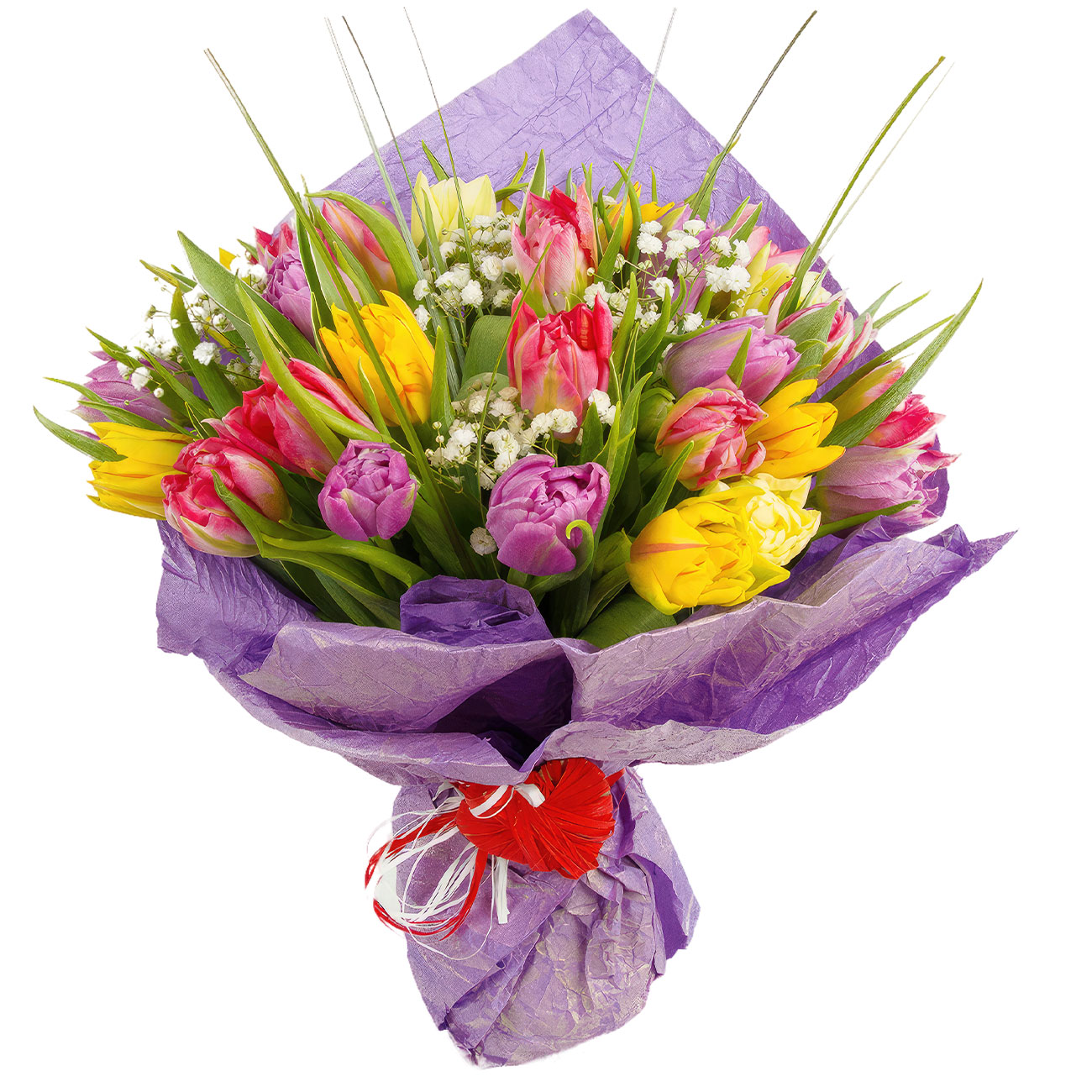 Тюльпан микс (желтый, сиреневый, розовый), гипсофила и зелень. Упаковка (лента, пленка, крафт, сетка, пленка матовая)