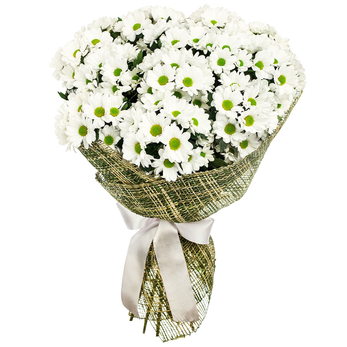 Хризантема кустовая белая. Упаковка (лента, пленка, крафт, сетка, пленка матовая)