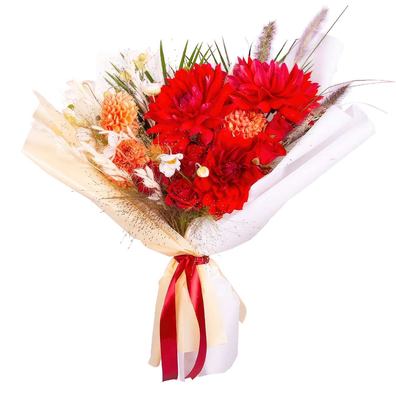 Георгина красная и оранжевая, роза одноголовая красная, экзотические и полевые цветы. Упаковка (лента, пленка, крафт, сетка, пленка матовая)