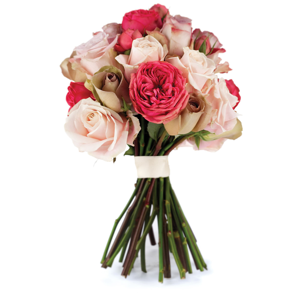 Роза одноголовая белая и капучино, роза пионовидная. Упаковка (лента, пленка, крафт, сетка, пленка матовая)