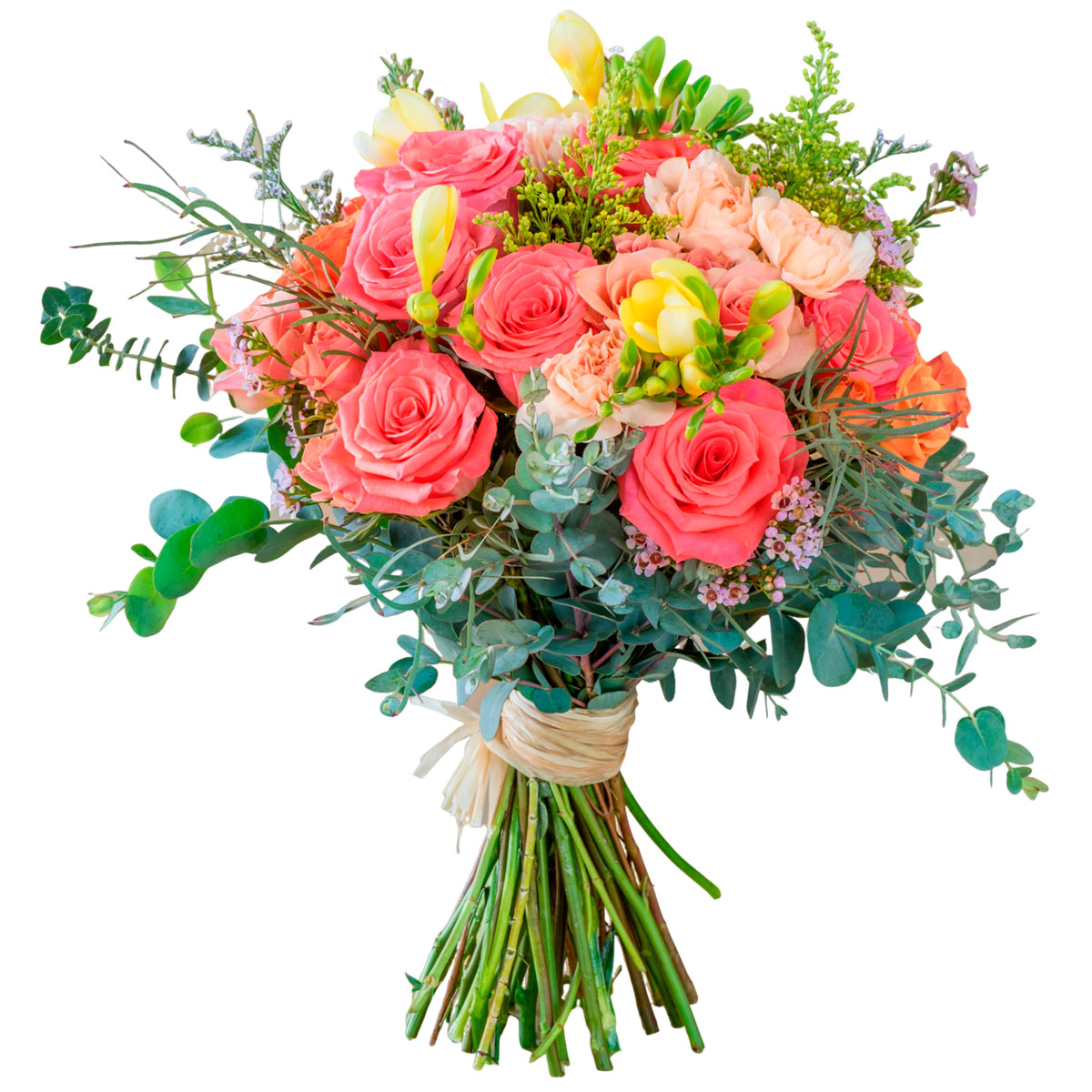 Роза одноголовая розовая, роза кустовая оранжевая, фрезия желтая, гвоздика кремовая, солидаго, эвкалипт. Упаковка (лента, пленка, крафт, сетка, пленка матовая)