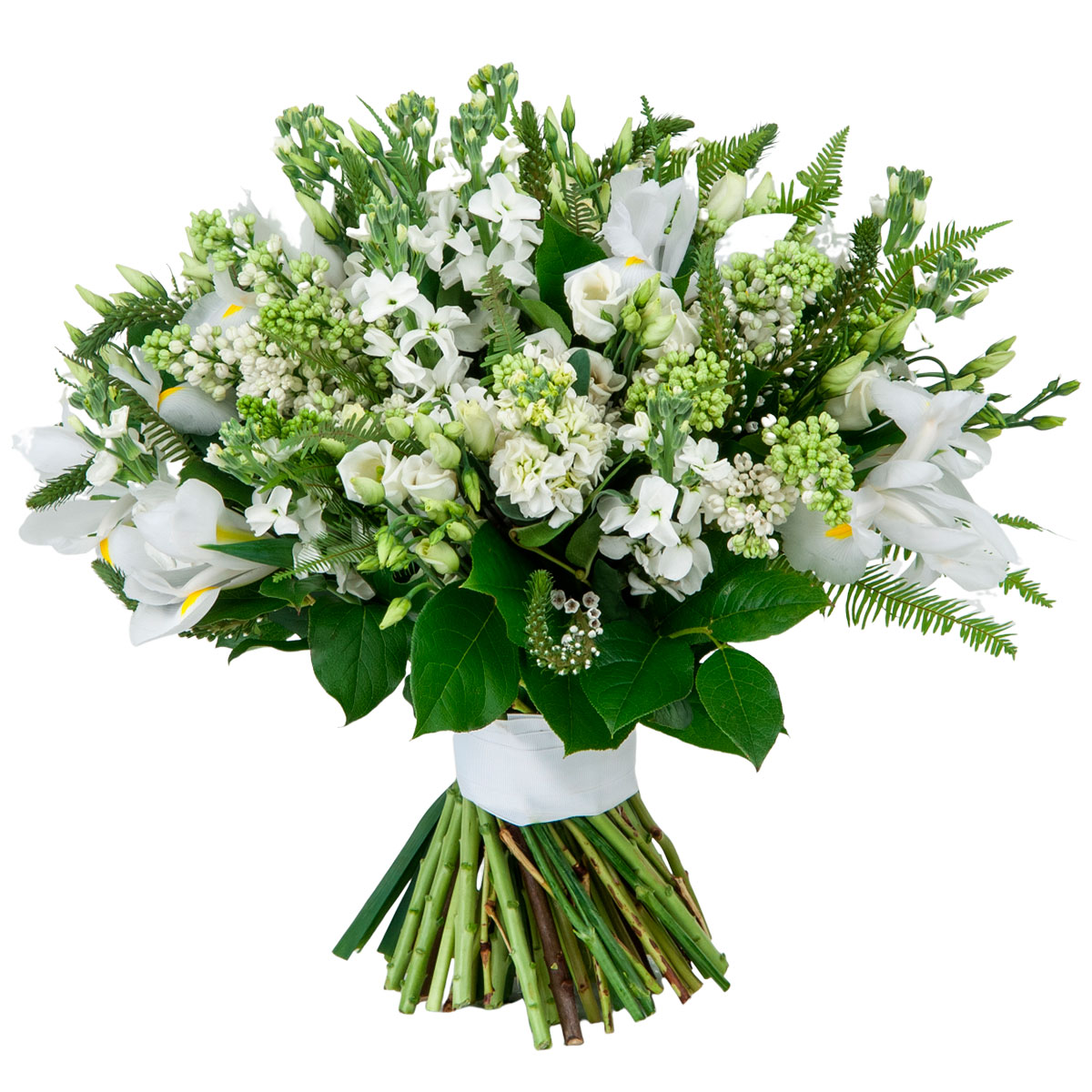 Ирис белый, сирень белая, маттиола белая, эустома белая, флокс белый, зелень. Упаковка (лента, пленка, крафт, сетка, пленка матовая)