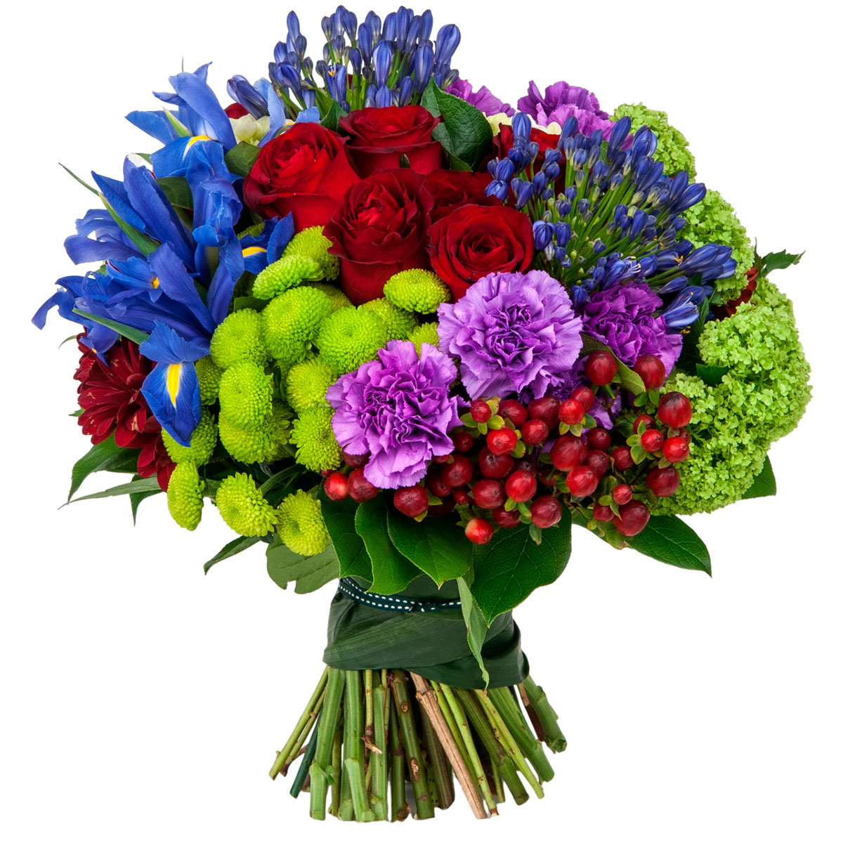 Роза одноголовая красная, ирис синий, хризантема кустовая зеленая и красная, гортензия зеленая, гвоздика сиреневая, гиперикум, аспидистра. Упаковка (лента, пленка, крафт, сетка, пленка матовая)