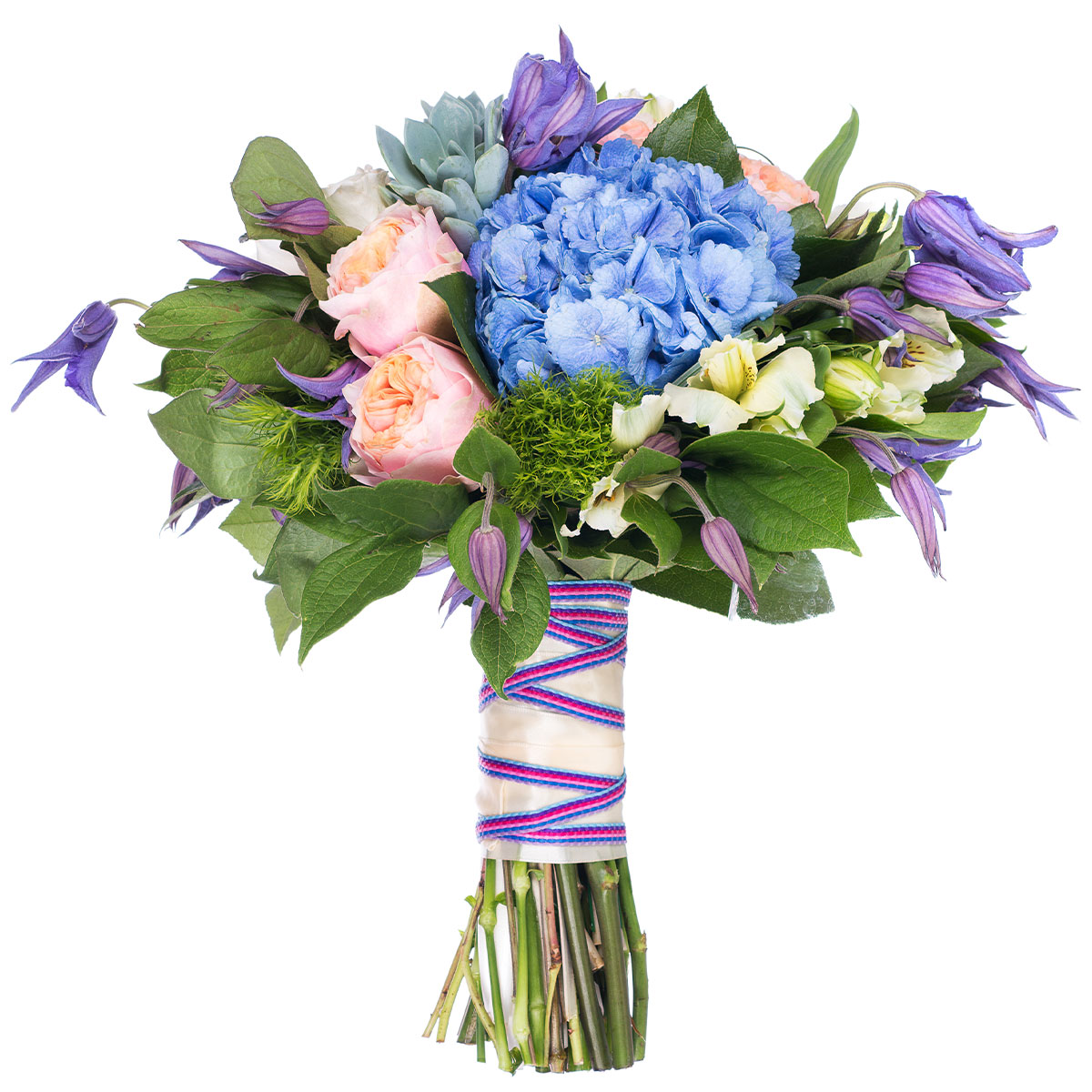 Гортензия синяя, роза одноголовая розовая, альстромерия белая, клематис, суккулент, зелень. Упаковка (лента, пленка, крафт, сетка, пленка матовая)