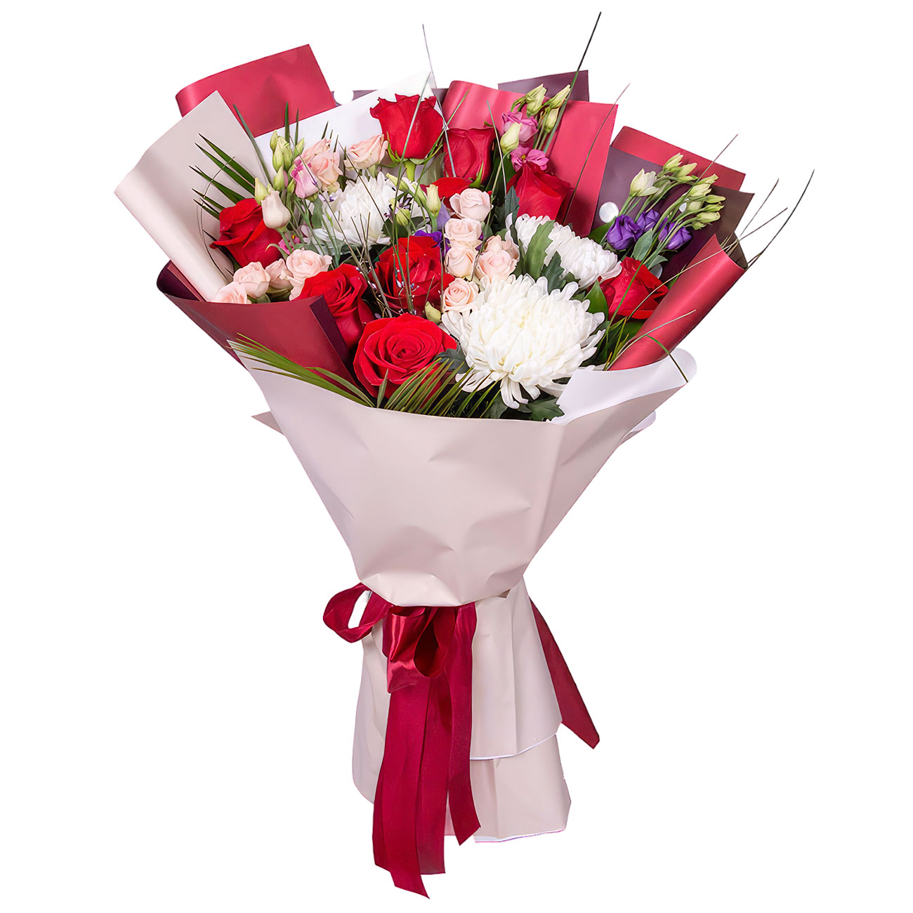 Роза одноголовая красная, хризантема одноголовая «Анастасия» белая, роза кустовая розовая, эустома фиолетовая, рубелины, зелень. Упаковка (лента, пленка, крафт, сетка, пленка матовая)