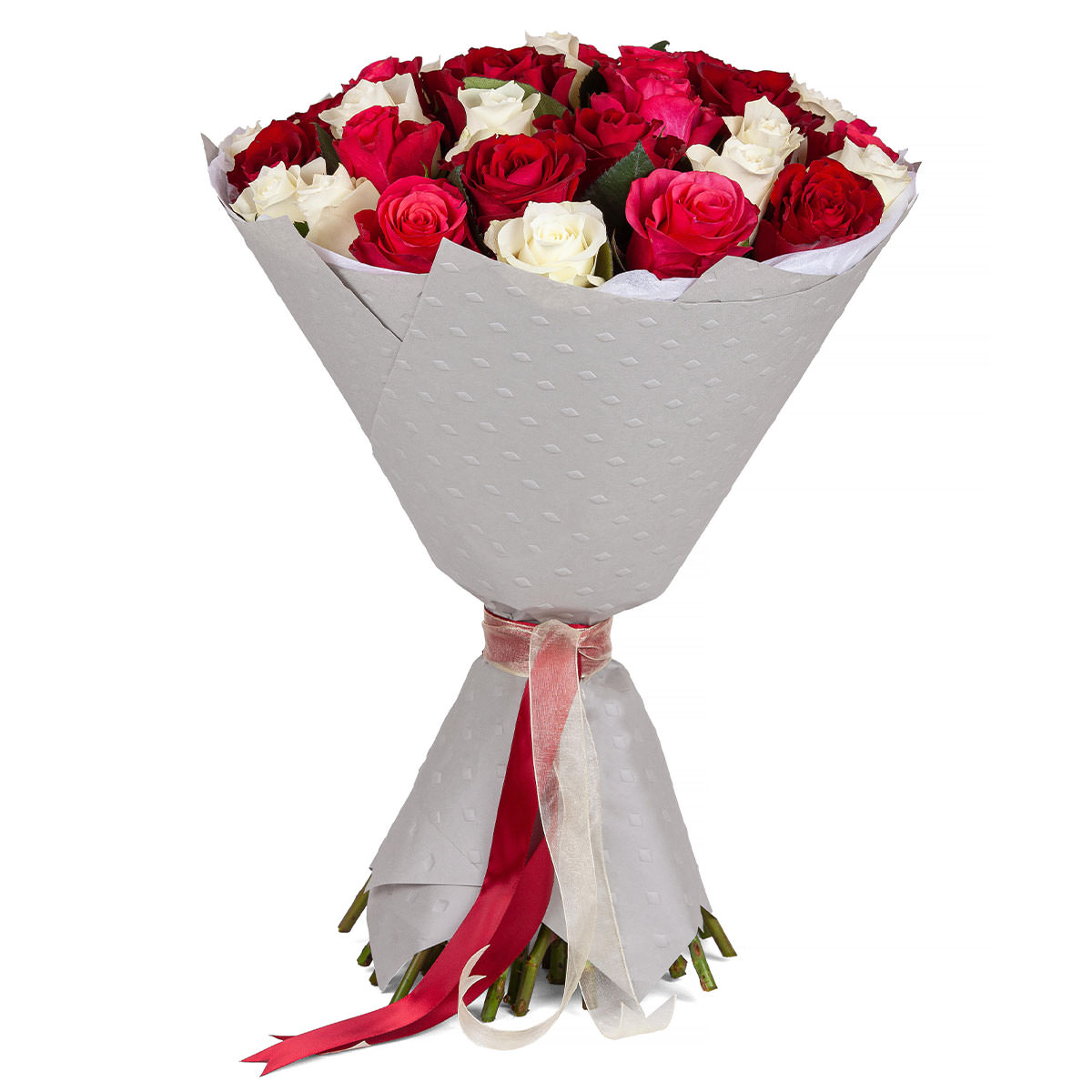 Роза одноголовая белая и красная. Упаковка (лента, пленка, крафт, сетка, пленка матовая)