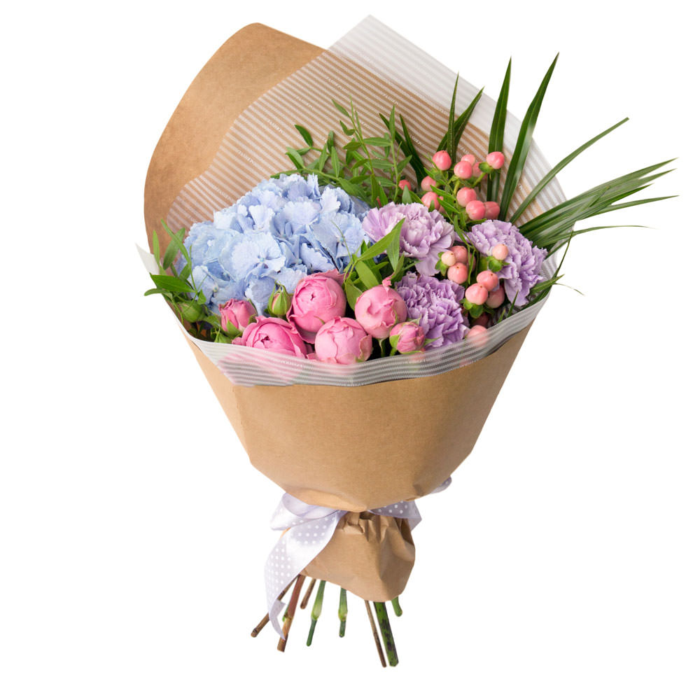 | Состав | Гвоздики, Гортензии, Кустовые розы, Пионовидные розы, Пионы |