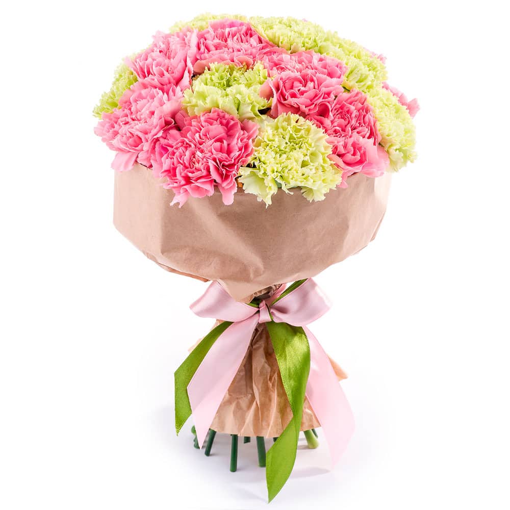 Гвоздика микс (желтая, розовая). Упаковка (лента, пленка, крафт, сетка, пленка матовая)
