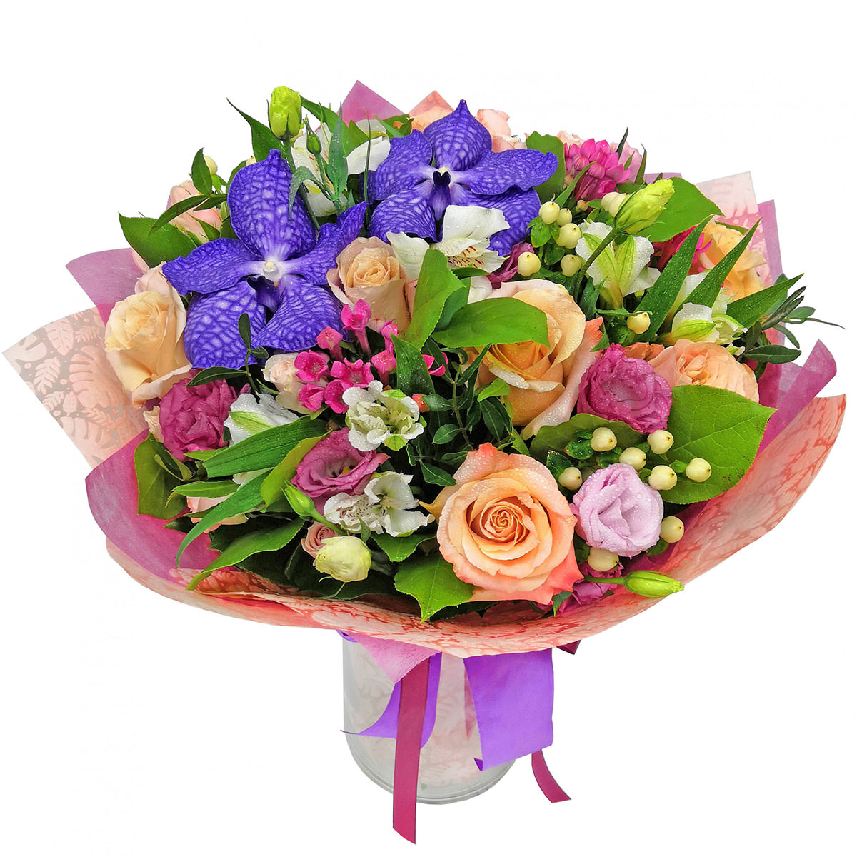 | Состав | Гвоздики, Кустовые розы, Орхидеи, Розы, Эвкалипт |