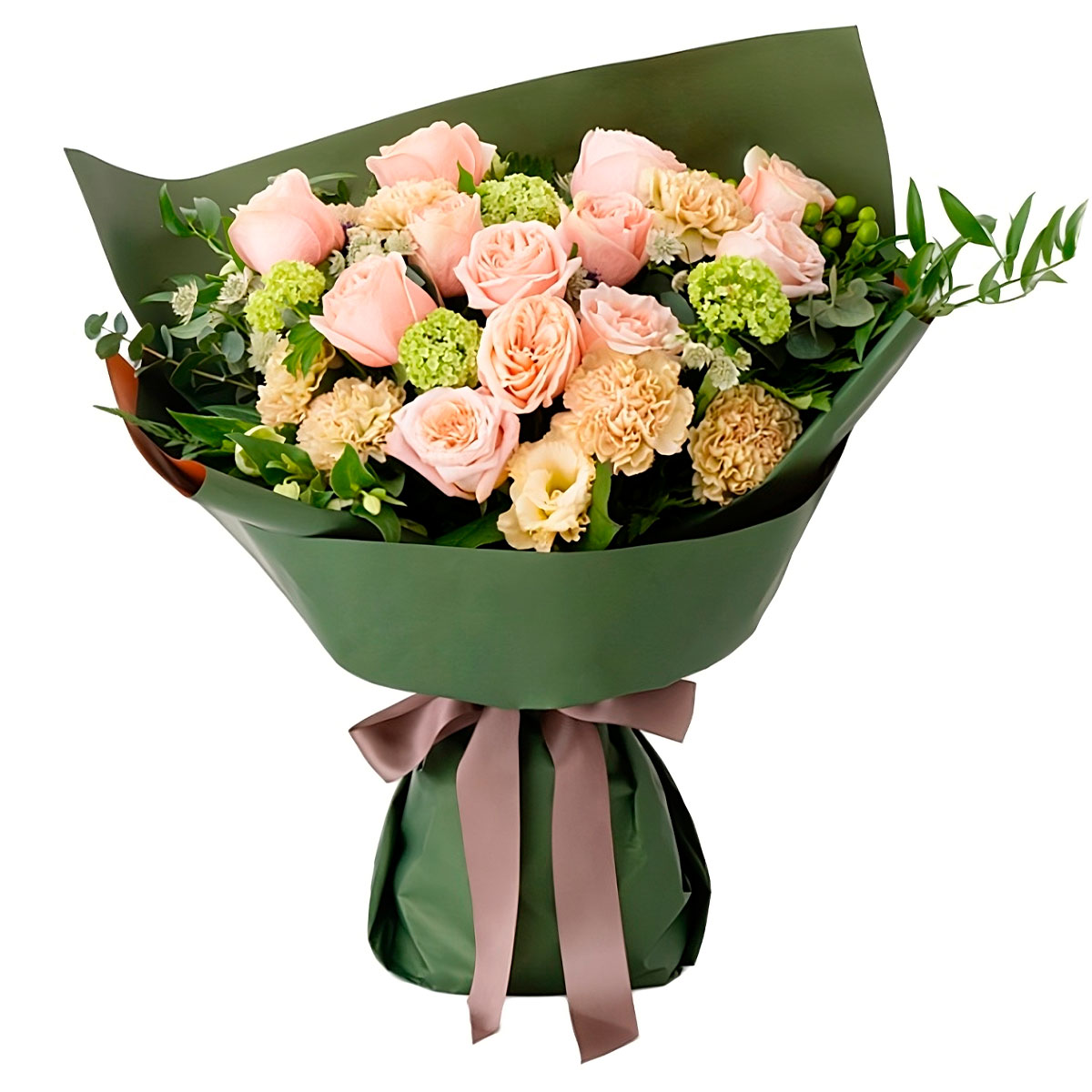 | Состав | Гвоздики, Пионовидные розы, Розы, Эвкалипт, Эустомы |