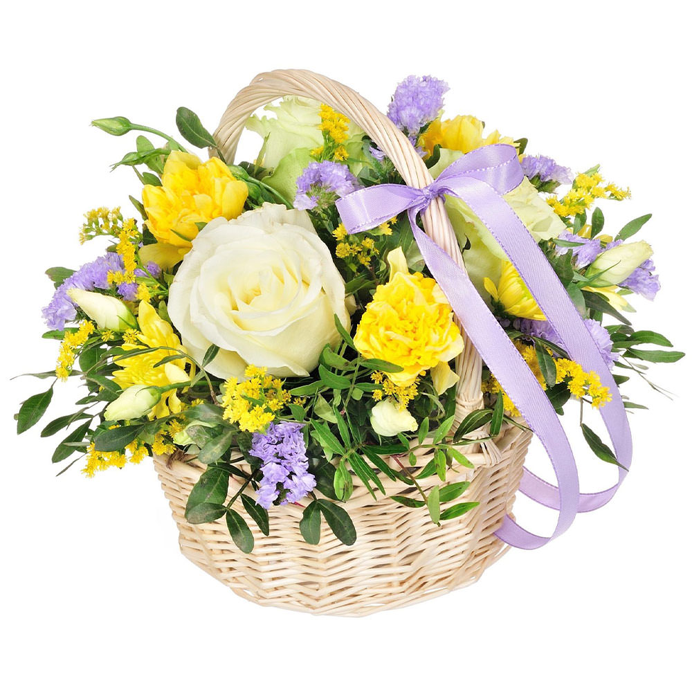 Роза одноголовая белая, фрезия, солидага, хризантема кустовая желтая, фисташка, статица. Упаковка (Корзина, оазис).