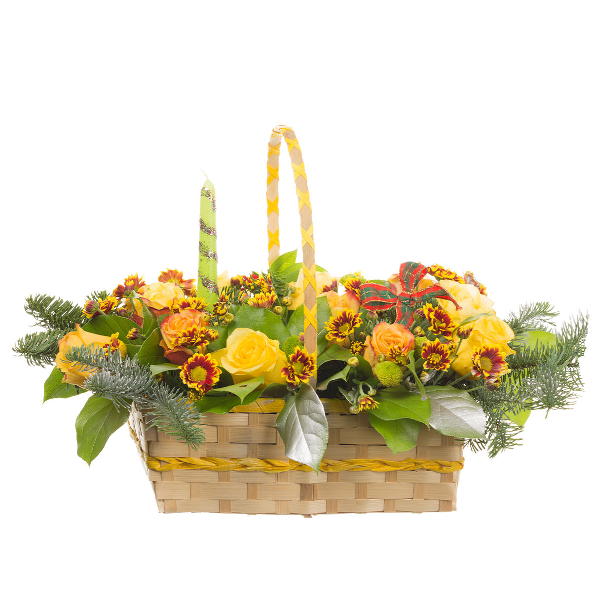 Роза одноголовая желтая, хризантема кустовая мини желто-красная и зеленая, пихта, свеча. Упаковка (Корзина, оазис, ящик).