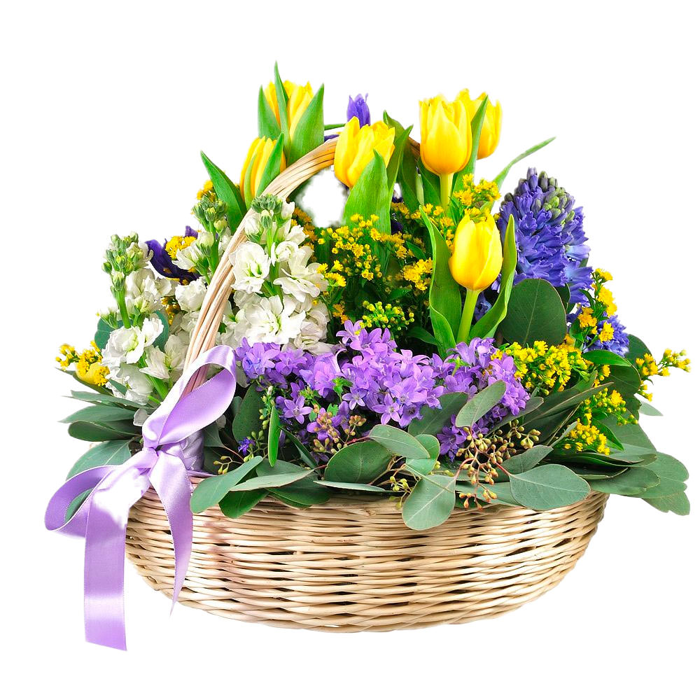 Кампанула, тюльпан желтый, гиацинт, маттиола белая, солидаго, ирис, эвкалипт. Упаковка (Корзина, оазис).