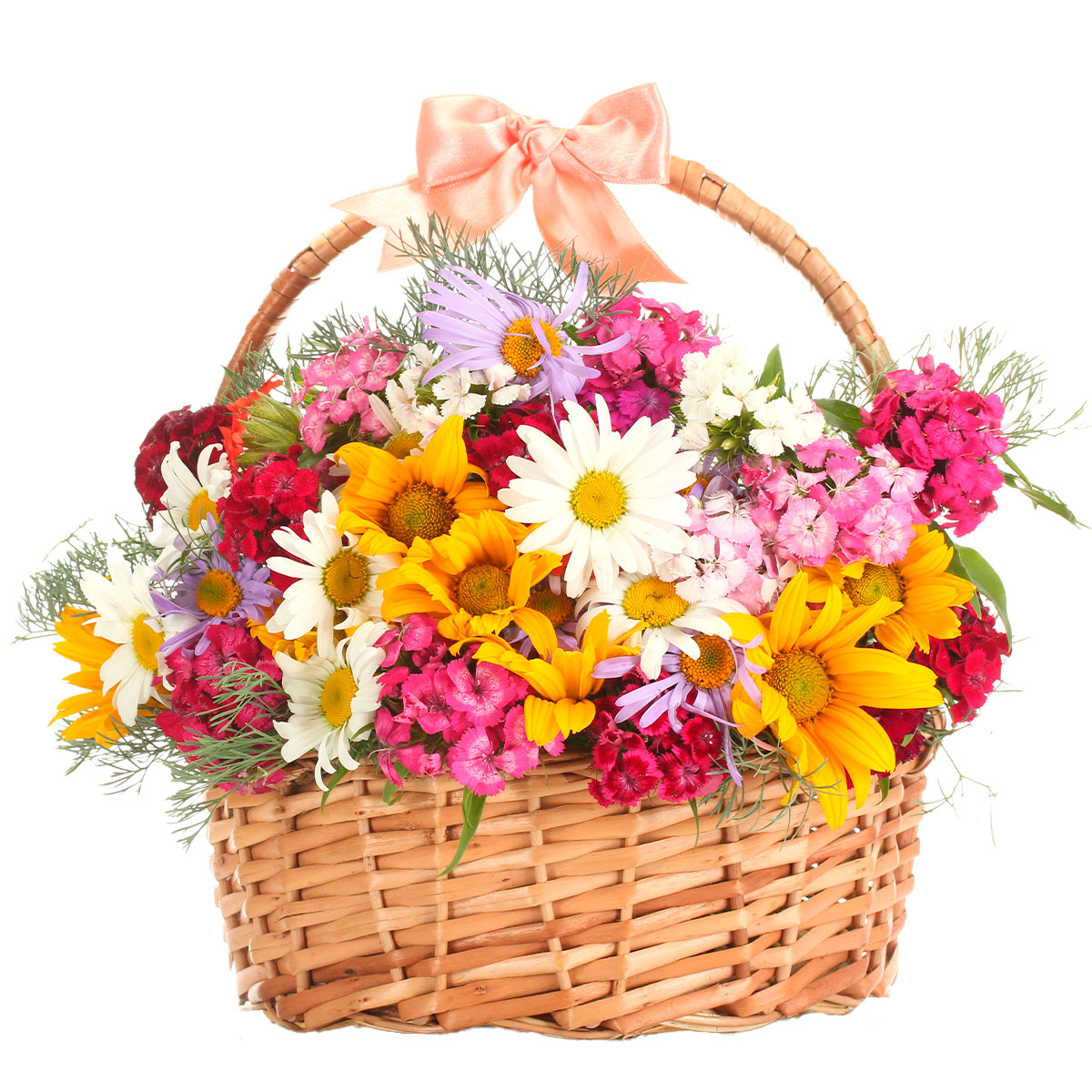 Ромашка белая, желтая и сиреневая, гвоздика турецкая. Упаковка (Корзина, оазис, ящик).