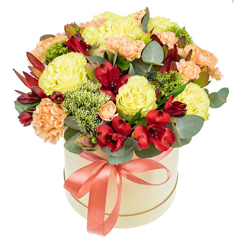 Роза одноголовая Эквадор, альстромерия красная, гвоздика кремовая, эвкалипт, зелень. Упаковка (шляпная коробка, квадратный бокс, коробка сердце, оазис)