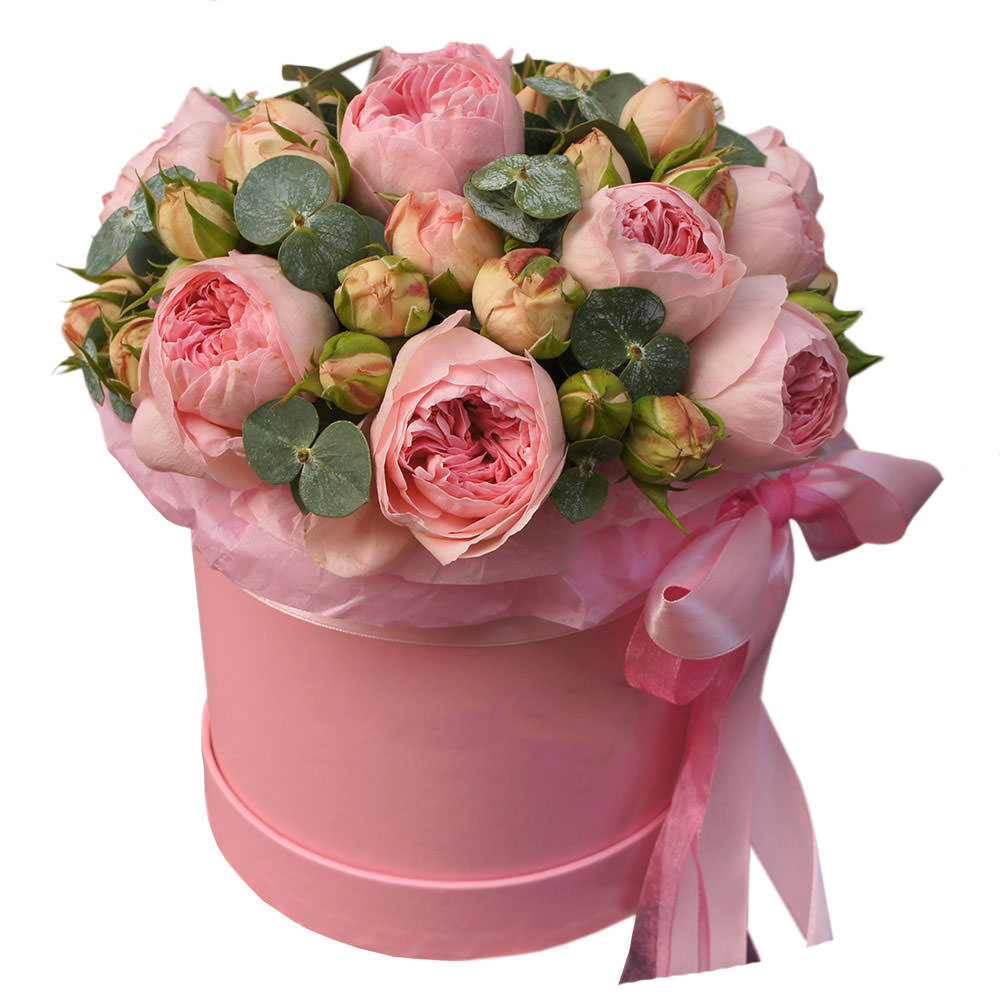 Роза пионовидная одноголовая розовая, роза кустовая розовая, эвкалипт. Упаковка (шляпная коробка, квадратный бокс, коробка сердце, оазис)