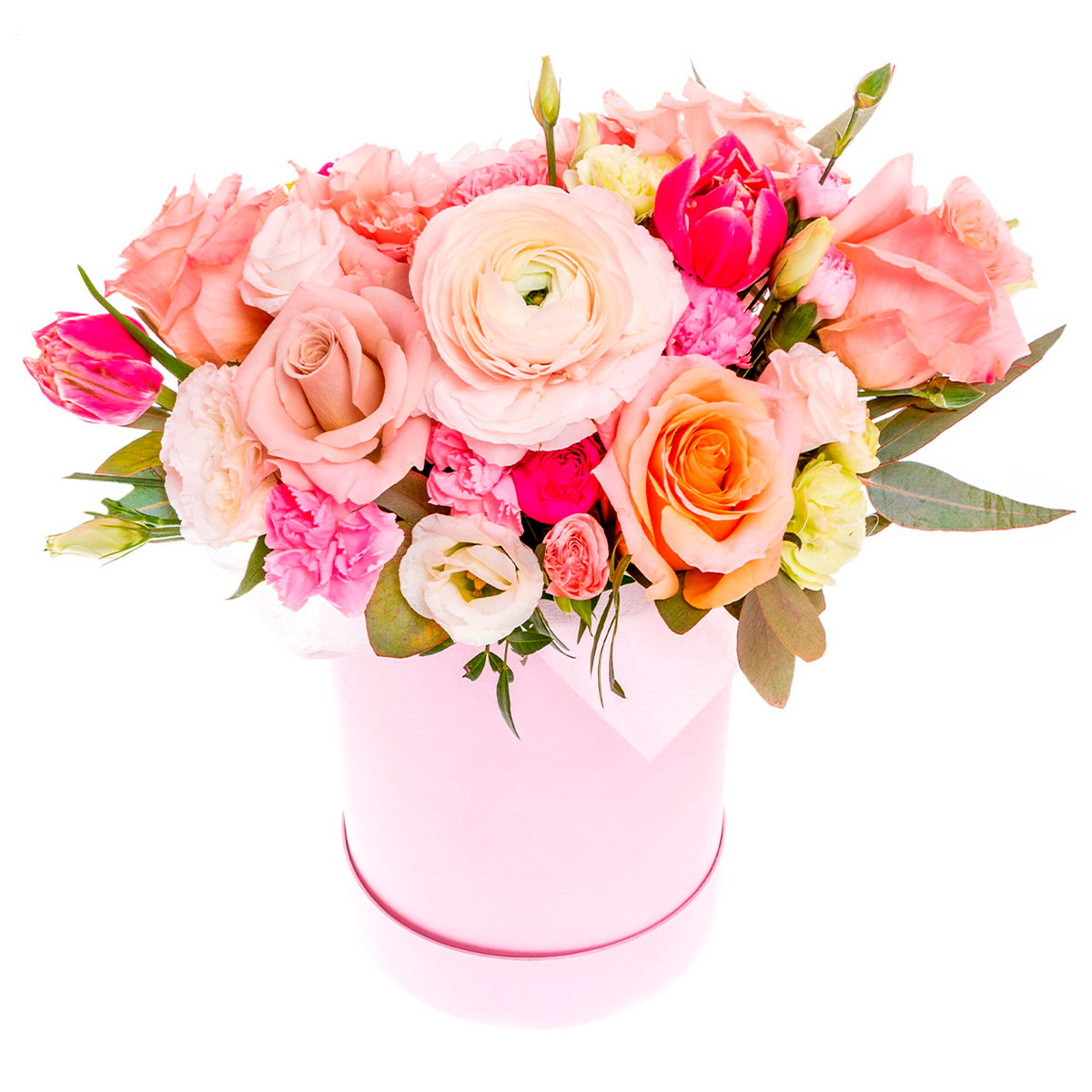 Роза одноголовая розовая, ранункулюс розовый, гвоздика розовая, эустома белая, тюльпан розовый, эвкалипт. Упаковка (шляпная коробка, квадратный бокс, коробка сердце, оазис)